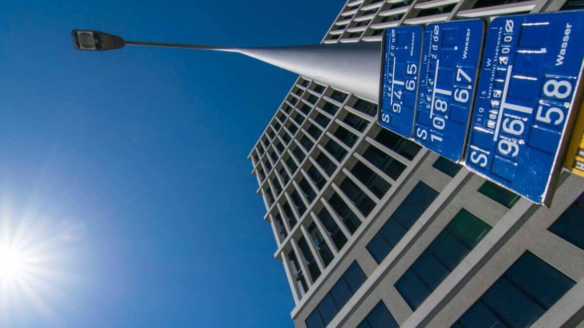 Bei diesem Bild bin ich mit der Kamera nahe an das Gebäude und an die Strassenlampen mit den farbigen Werkschildern gegangen. Die Kamera habe ich mit einem Weitwinkelobjektiv bestückt. Dass die Sonne ebenfalls noch mit aufs Bild passte, war das Tüpfchen auf dem i. Durch die gewählte kleine Blende entstanden folglich die Strahlen um die Sonne – ein Blendenstern.