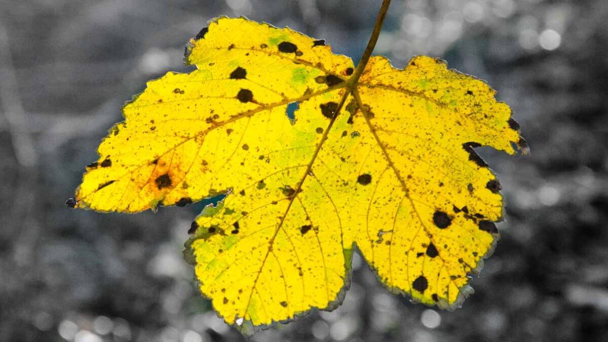 Ich fand ein anderes Blatt und dahinter einen ruhigeren, dunkleren Hintergrund, damit die Leuchtkraft des Herbstblattes gut zur Geltung kam. Die Belichtung korrigierte ich um eine Blendenstufe. Zudem stelle ich in Lightroom mit dem RAW-Bild ein selektives Schwarzweiss-Bild her, damit die Farbe des Herbstes noch besser zur Geltung kommt.
