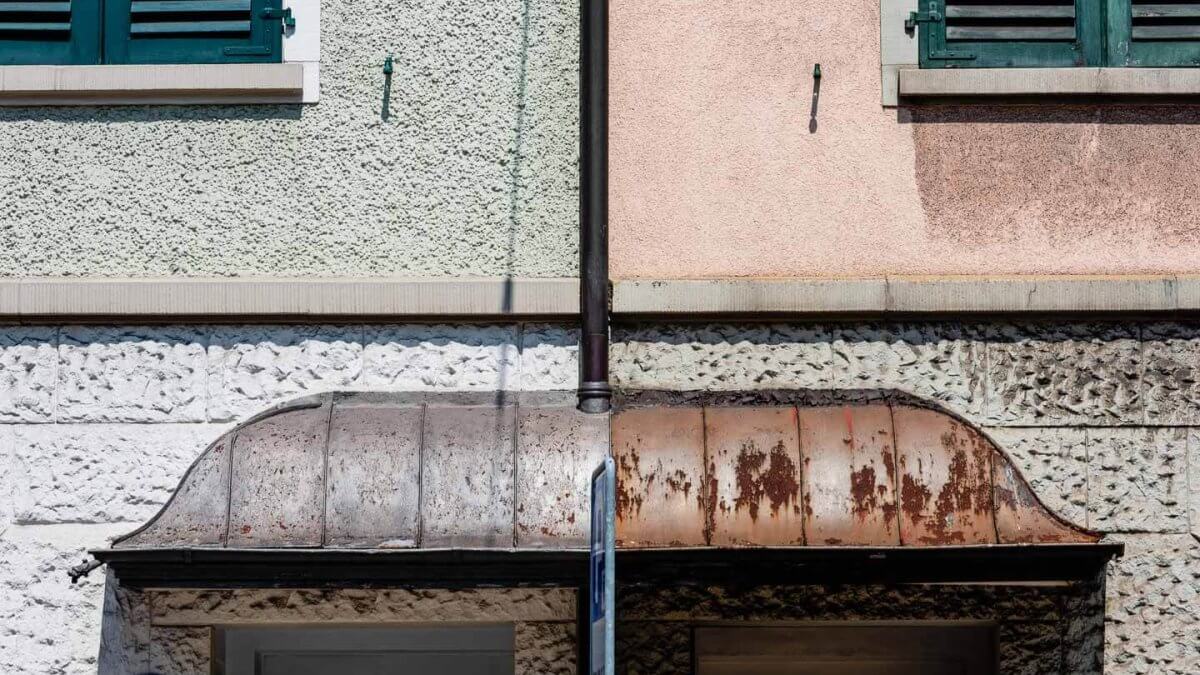 Dieses Bild gefällt mir zum Thema Symmetrien fotografieren sehr gut: Es eine Form-Symmetrie, die von den Farben und Strukturen des länger nicht renovierten Hausteils lebt. Links etwas neuer, rechts hat der Zahn der Zeit deutlich genagt.
