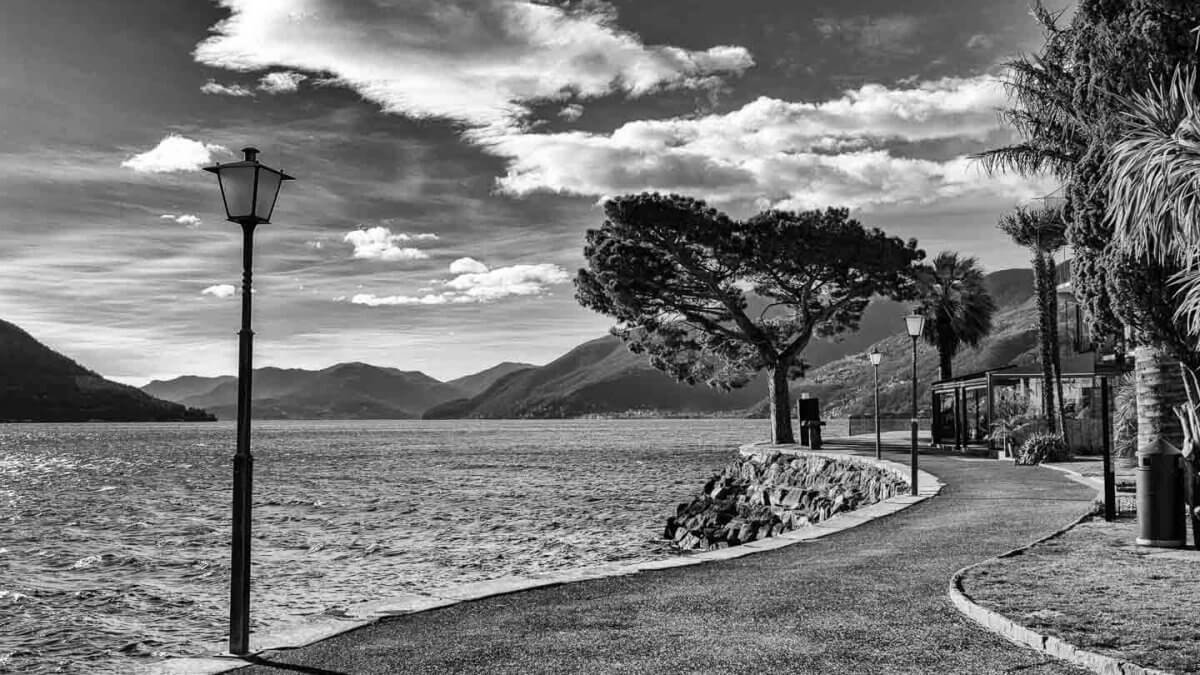 Im unteren Bild – Nachtaufnahme von Locarno – ist die Struktur der Stadt mit ihren Strassen wichtig. Der Horizont mit dem spiegelnden Ufer auf der anderen Seite des Lago Maggiore liegt im obersten Teil des Bildes.