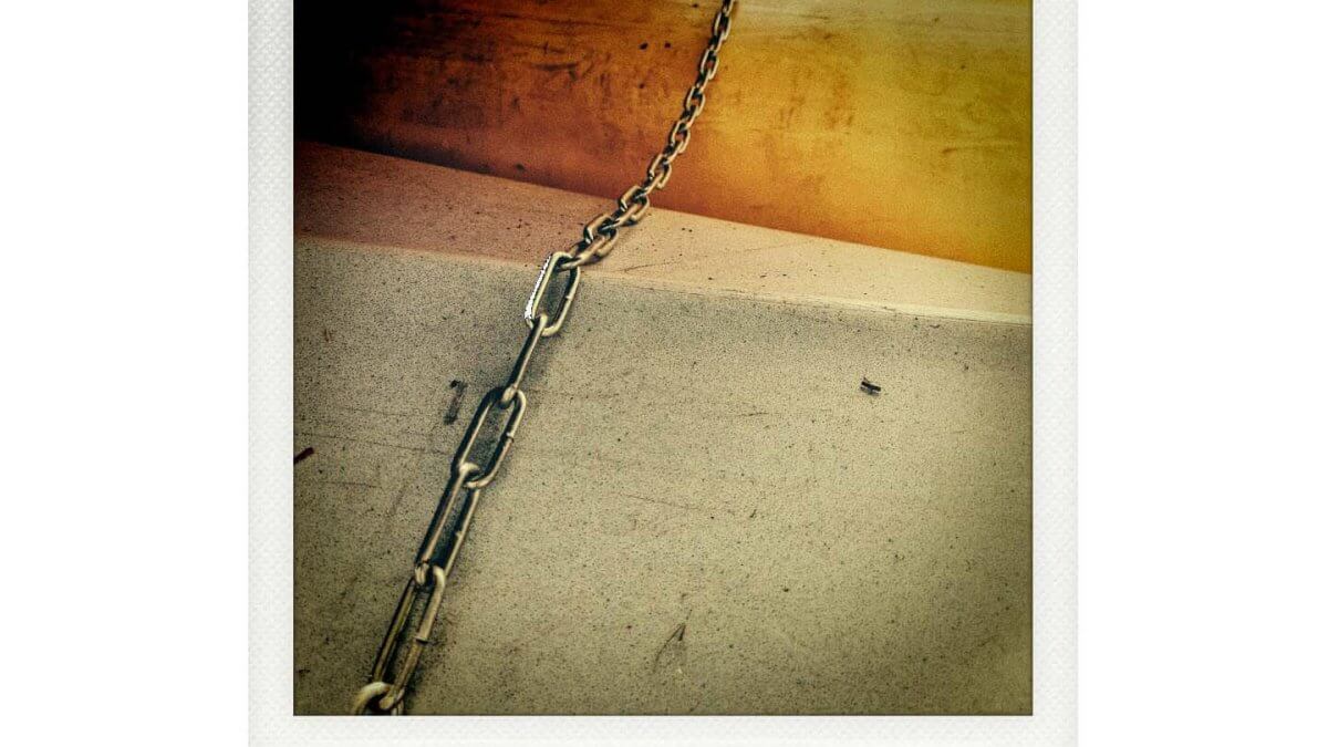Im Sommer ist hier am See immer viel los. In der Nachsaison werden die Boote winterfest gemacht oder zumindest gegen die Witterungseinflüsse etwas geschützt. Auf den umgedrehten Booten, Kiel oben, entdeckte ich die Kette, welche über die Bootskörper hing. Die verwitterten Oberflächen in weiss und orange haben es mir angetan. Mit der Kultcamera, einer App, welche Abzüge alter Kameras imitiert, fotografierte ich das Sujet mit unterschiedlichen Ausschnitten. Aus den fünf Bilder passte mir das ausgewählte Foto am besten. Es ist komplett auf die Linien reduziert. Keine anderen, für das Bild unnötige Details erscheinen. Die Bilder sind eine Momentaufnahme, können nicht nachträglich zugeschnitten oder verändert werden.